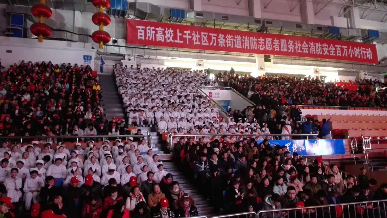 2016年11月9日上午,南岗校区保卫处牵头,学生处组织我校300名大学生消防志愿者参加了在黑龙江大学主会场由黑龙江省政府消防安全委员会、哈尔滨市政府消防安全委员会主办,黑龙江大学协办的“消除火灾隐患,共建平安社区——我们在行动!”消防公益活动暨2016年黑龙江省“119”消防宣传周活动,省人大常委会副主任庞义华、省政府副省长孙永波、省政协副主席杜吉明出席活动。3000名社会各界消防志愿者参加了主会场活动。在这次活动中,我校大学生志愿者身穿白色护士服,高举大学生志愿者旗帜,与现场主持人积极互动,展示出护高专大学生志愿者的风采,突出了“全民消防,生命至上”这一主题。